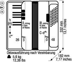 This is our smallest piano keyboard accordion. 26 regular sized keys and 48 basses. Two reed banks for the tremolo and three reed banks for the bass. Two different registers (clarinet and tremolo) but three switches. This instrument is a standard student model, but could also be used by the professional looking for a light weight stage accordion as it provides diminished 7th chords. Includes straps and case.