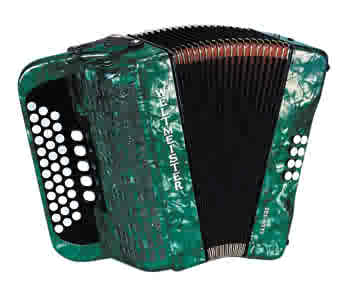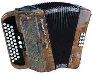 This traditional diatonic Club accordion has two sets of reeds in the